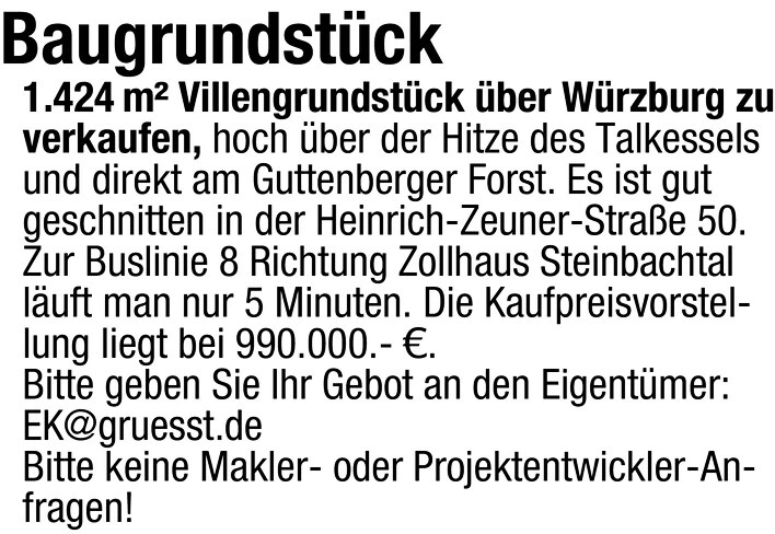 Kontakt: Bitte geben Sie Ihr Gebot an den Eigentümer: EK@gruesst.de