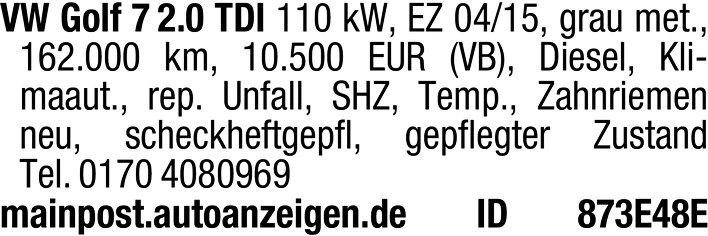 VW Golf 7 2.0 TDI 110 kW, EZ 04/15, grau met., 162.000 km, 10.500 EUR (VB), Diesel, Klimaaut., rep. Unfall, SHZ, Temp., Zahnriemen neu, scheckheftgepfl, gepflegter Zustand Tel. 0170 4080969