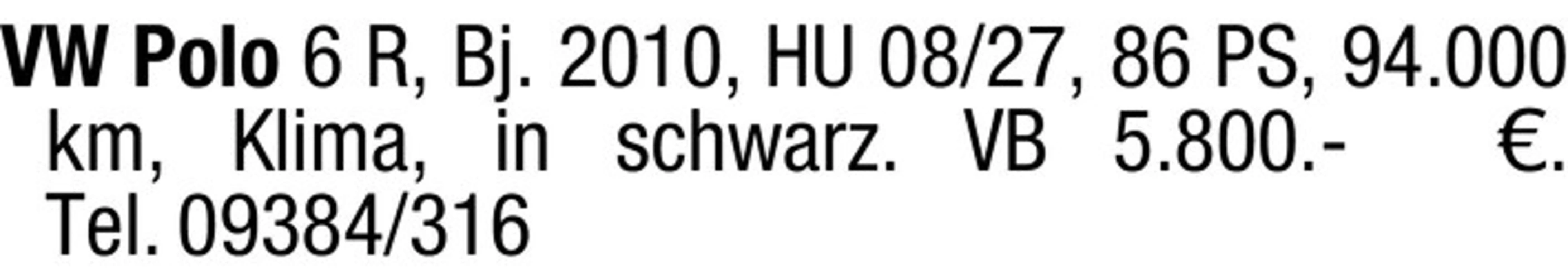 text VW Polo 6 R, Bj. 2010, HU 08/27, 86 PS, 94.000 km, Klima, in schwarz. VB 5.800.- . Tel. 09384/316