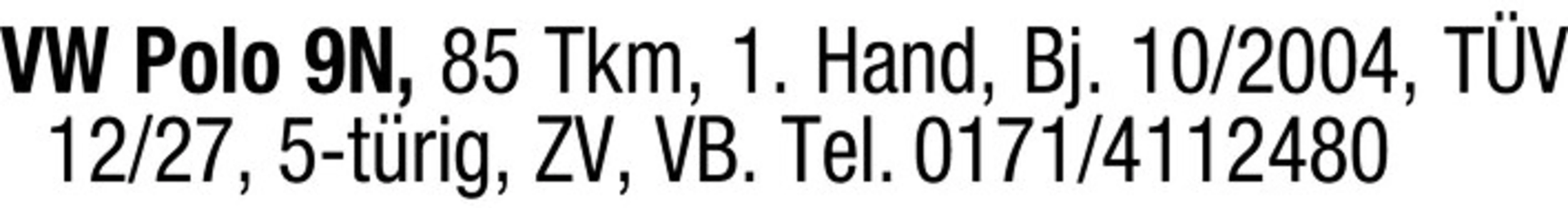 VW Polo 9N, 85 Tkm, 1. Hand, Bj. 10/2004, TV 12/27, 5-trig, ZV, VB. Tel. 0171/4112480