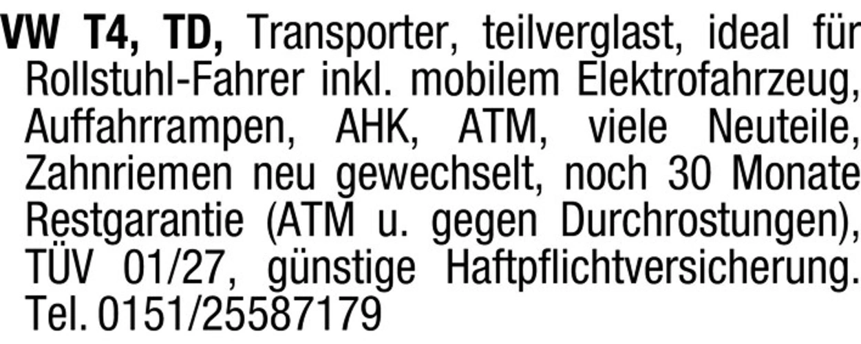 VW T4, TD, Transporter, teilverglast, ideal fr Rollstuhl-Fahrer inkl. mobilem Elektrofahrzeug, Auffahrrampen, AHK, ATM, viele Neuteile, Zahnriemen neu gewechselt, noch 30 Monate Restgarantie (ATM u. gegen Durchrostungen), TV 01/27, gnstige Haftpflichtversicherung. Tel. 0151/25587179