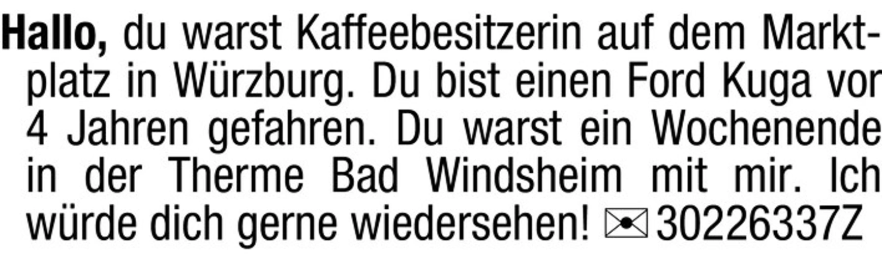 Hallo, du warst Kaffeebesitzerin auf dem Marktplatz in Wrzburg. Du bist einen Ford Kuga vor 4 Jahren gefahren. Du warst ein Wochenende in der Therme Bad Windsheim mit mir. Ich würde dich gerne wiedersehen! Chiffre 30226337