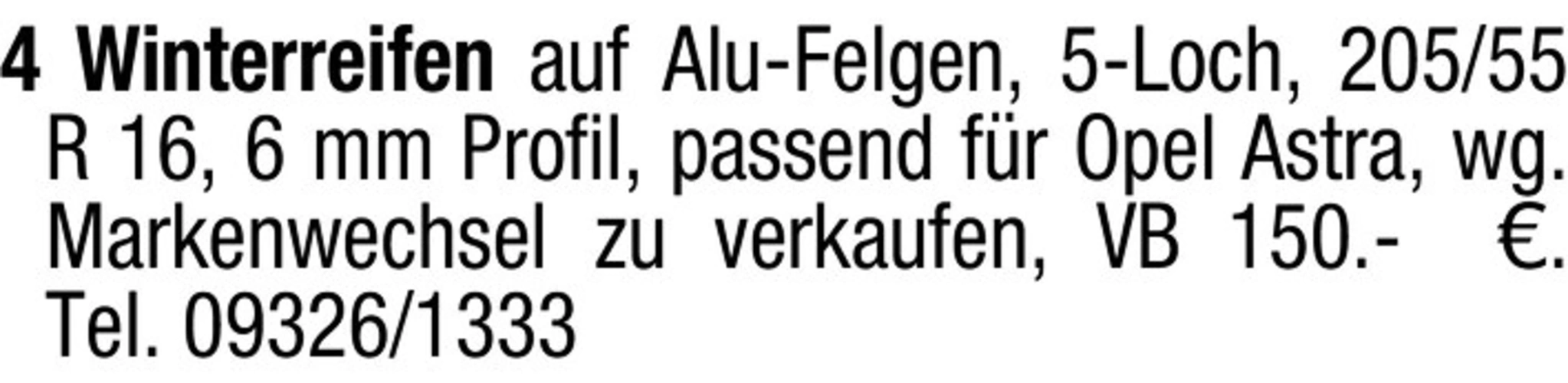 4 Winterreifen auf Alu-Felgen, 5-Loch, 205/55 R 16, 6 mm Profil, passend für Opel Astra, VB 150.-. Tel. 09326/1333