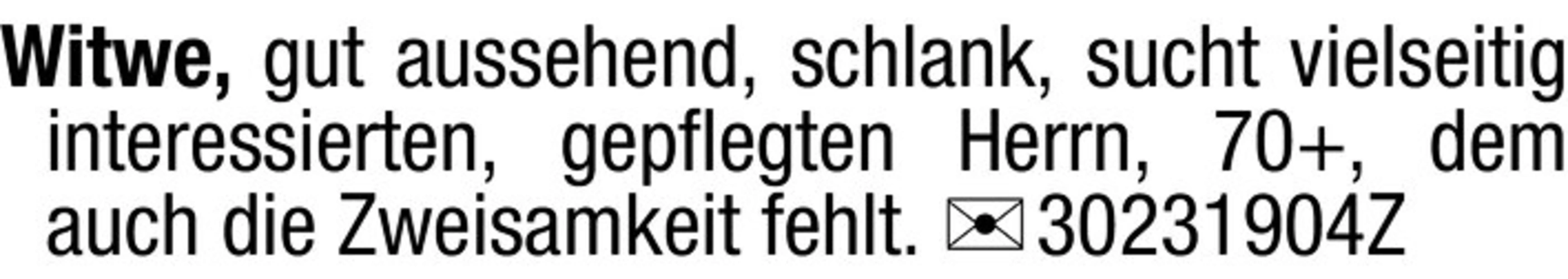 Witwe, gut aussehend, schlank, sucht vielseitig interessierten, gepflegten Herrn, 70 , dem auch die Zweisamkeit fehlt. Chiffre 30231904