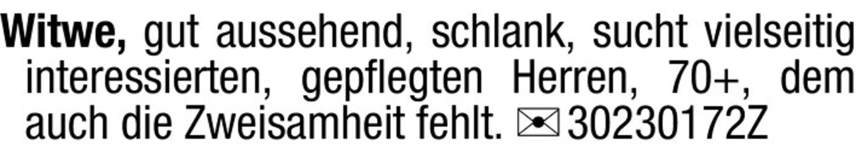 Witwe, gut aussehend, schlank, sucht vielseitig interessierten, gepflegten Herren, 70, dem auch die Zweisamkeit fehlt.