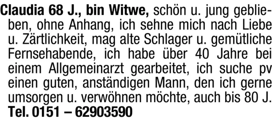 Claudia 68 J., bin Witwe, schn u. jung geblieben, ohne Anhang, ich sehne mich nach Liebe u. Zrtlichkeit, mag alte Schlager u. gemtliche Fernsehabende, ich habe ber 40 Jahre bei einem Allgemeinarzt gearbeitet, ich suche pv einen guten, anstndigen Mann, den ich gerne umsorgen u. verwhnen mchte, auch bis 80 J. Tel. 0151 - 62903590