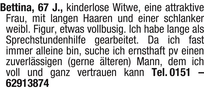 Ich habe lange als Sprechstundenhilfe gearbeitet. Da ich fast immer alleine bin, suche ich ernsthaft privat einen zuverlässigen (gerne älteren) Mann, dem ich voll und ganz vertrauen kann.