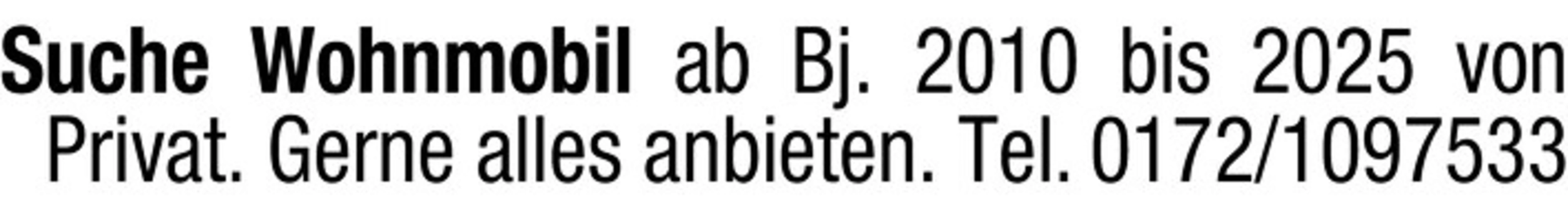 Suche Wohnmobil ab Bj. 2010 bis 2025 von Privat. Gerne alles anbieten. Tel.: 0172/1097533