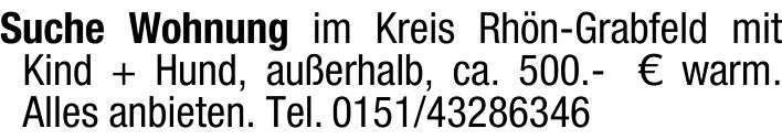 Suche Wohnung im Kreis Rhön-Grabfeld mit Kind + Hund, außerhalb, ca. 500.- warm.