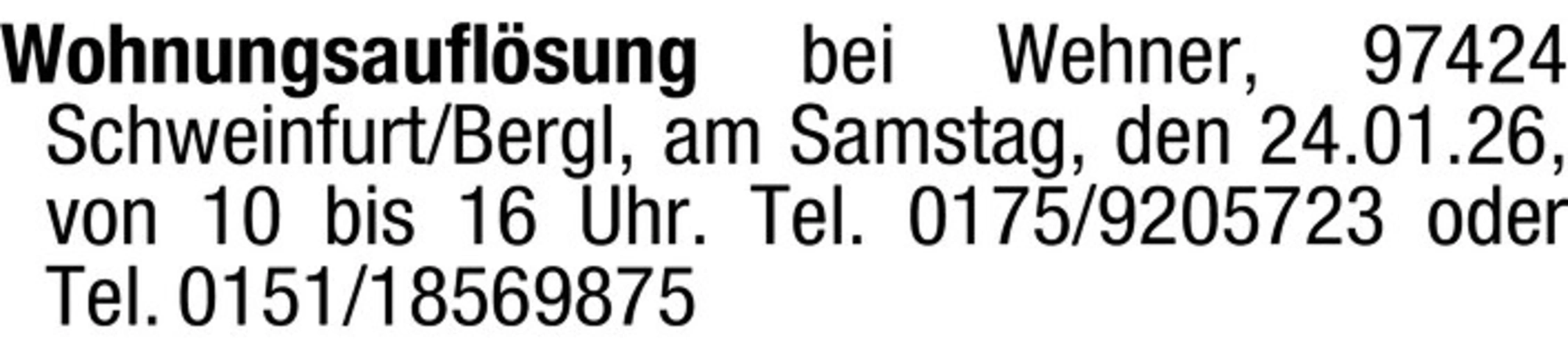 Wohnungsauflsung bei Wehner, 97424 Schweinfurt/Bergl, am Samstag, den 24.01.26, von 10 bis 16 Uhr. Tel. 0175/9205723 oder Tel. 0151/18569875