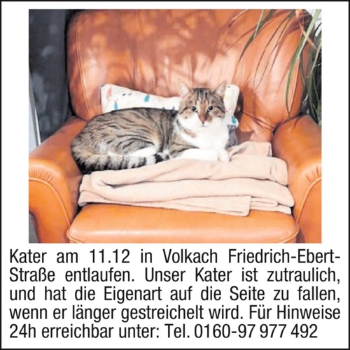 Kater am 11.12 in Volkach Friedrich-Ebert-Strae entlaufen.