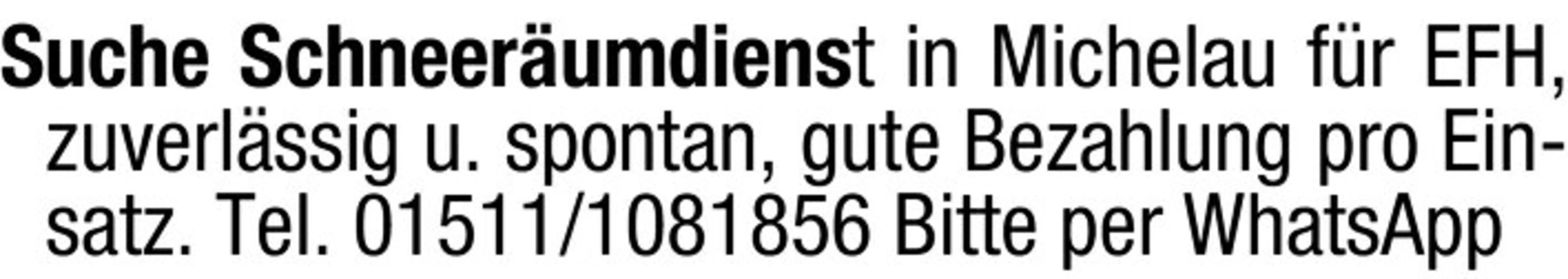 Suche Schneerumdienst in Michelau für EFH, zuverlässig und spontan, gute Bezahlung pro Einsatz.