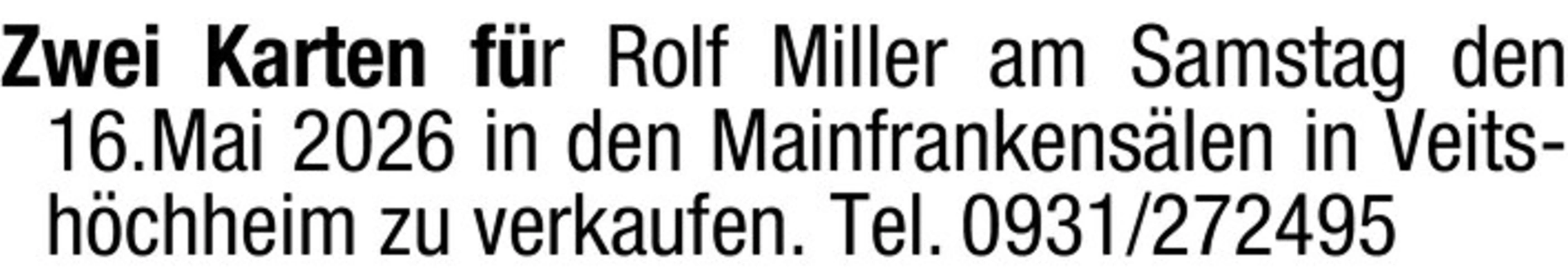 Zwei Karten fr Rolf Miller am Samstag den 16.Mai 2026 in den Mainfrankenslen in Veitshchheim zu verkaufen. Tel. 0931/272495