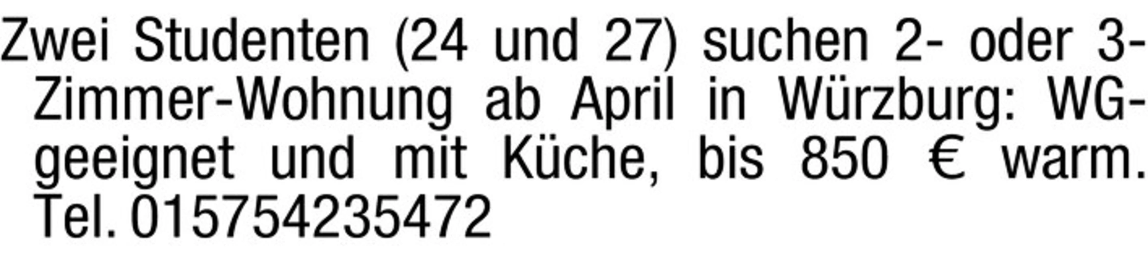 Zwei Studenten (24 und 27) suchen 2- oder 3- Zimmer-Wohnung ab April in Wrzburg: WG-geeignet und mit Kche, bis 850 warm. Tel.: 015754235472