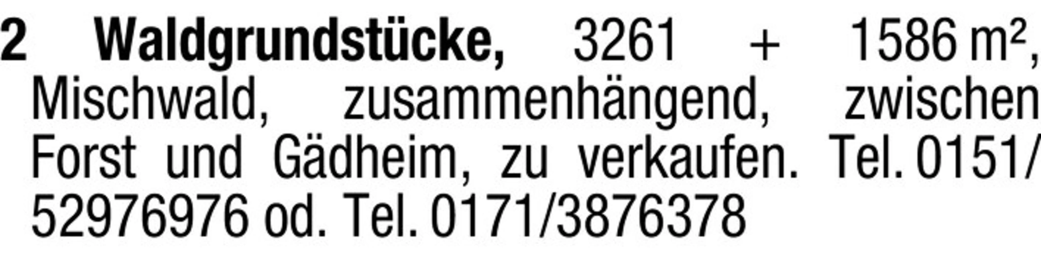 2 Waldgrundstücke, 3261 1586 m, Mischwald, zusammenhängend, zwischen Forst und Gdheim.